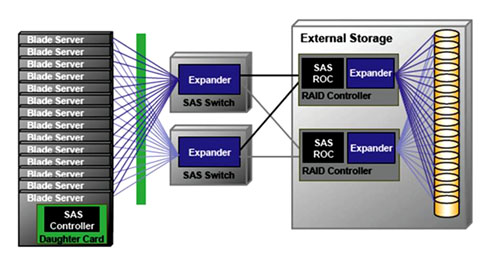 在企業HDD硬碟儲存應用上,SAS已成替代光纖的重要選擇。它能提供全天候的儲存應用,並透過雙埠HDD來提高傳輸率和做到錯誤後轉移(Fail-over)的功能。在運用上可做為Server DAS或後端儲存系統。善用SAS交換器及開關(Switch)可以提供相當大的擴充彈性,同時獲得高可用性、高頻寬,以及容易設定和管理等優勢。對於機架及刀鋒(Blade)伺服器(圖2),或外部儲存應用都是很好的選擇方案。