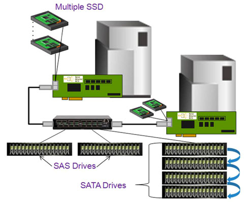 在標準高容量伺服器的SAS應用上,其內部的儲存可透過交換器來擴充,能提供穩定的6Gbit/s SAS效能,I/O的效能也具有延展性,以及高可靠性及備援性(Redundancy)。此外,透過點對點序列技術,接線的方式變得很單純,而且SATA、SAS和SSD可以相容建置在一起。