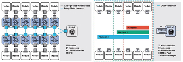在傳統電動車電池方面,有線線路支援電池組中各單元(Cell)與電子控制單元(ECU)之間的通訊,ECU負責管理電池運作並確保電池為汽車提供電力。電池內部通訊的需求反映出大型電池組的複雜架構:由多個模組構成,每個模組含有多個單元。自然的製造變異(Production Variation)意謂每個單元可能有個別的特性,其變異會在允許公差範圍內。為達到最大的電池容量、壽命、以及效能,電池運作的關鍵參數,電壓、充/放電電流、以及溫度都必須對每個模組個別進行監視與記錄,而單元監視的任務就落在BMS身上。