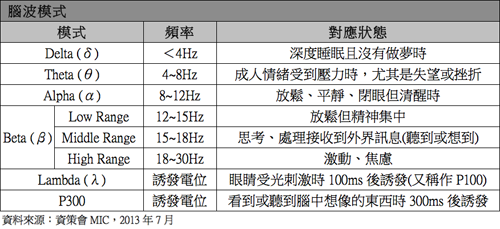 不須訓練且能主動產生的只有第三類的情緒腦波,主要種類有δ、θ、α、β波(表1)。