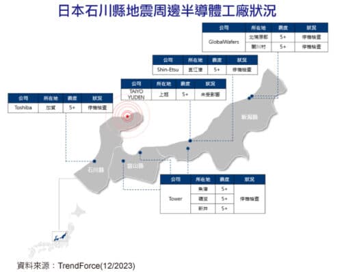 根據TrendForce調查日本石川縣能登地區強震影響範圍,周邊包含MLCC廠太陽誘電(TAIYO YUDEN)、矽晶圓(Raw Wafer)廠信越(Shin-Etsu)、GlobalWafers、半導體廠Toshiba及Tower與新唐共同營運之TPSCo等相關工廠皆位於震區。由於現階段半導體仍處下行週期,且時序已進入淡季,部分零組件仍有庫存,加上多數工廠落在震度4至5級,均在工廠耐震設計範圍內。由於多數工廠已初步檢查機台,發現並未受到嚴重災損,TrendForce研判影響應在可控範圍內。