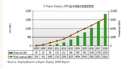 電子書無疑是2009年經濟風暴之下最火紅的創新產品,因其省電、易讀性優勢逐漸獲得消費者青睞。此外,目前開發廠商正逐漸針對畫素反應速度、彩色化、可捲曲式基板、觸控面板整合及面板的大型化等持續改良,更讓電子書的未來發展充滿期待。根據DisplaySearch預計,電子紙面板的數量成長將由2009年的二千萬片成長至2015年的八億片,電子紙面板產值將由2009年的4億美金成長到2015年的60億美金,並將在2018年接近百億美金,成為繼觸控面板後最耀眼的明星產業。