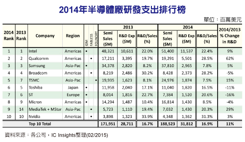 市調機構IC Insights公布2014年十大半導體廠研發支出排行榜,英特爾(Intel)、高通(Qualcomm)、三星(Samsung)及博通(Broadcom)依舊囊括前四名席次;台積電則以18億7,400萬美元名列第五,較2013年上升兩位。聯發科在合併晨星後,2014年研發開支大幅增加29%,達14億3,000萬美元,排名由原本第十四名竄升至第九名。