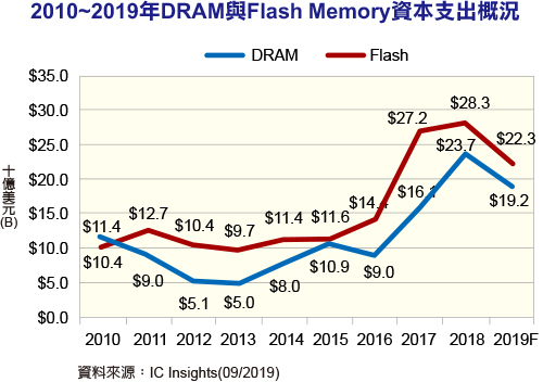 七年來,記憶體設備資本支出的比重大幅增加,從2013年的27%(147億美元)成長到2018年創紀錄的49%(520億美元)紀錄,2019年資本支出約416億美元,2013~2019年的年複合成長率為18.9%。2017年和2018年支出最大的IC產品是Flash記憶體/非揮發性記憶體類別,三星、SK海力士和美光三家大廠DRAM和NAND記憶體都積極投資,而英特爾、東芝Memory、Western Digital、SanDisk和XMC、Yangtze River Storage Technology在過去18個月中均大幅提高了3D NAND快閃記憶體容量, DRAM和NAND記憶體市場已進入產能過剩和價格疲軟的時期。 DRAM和NAND快閃記憶體的每位元價格急劇下跌,以及對2019年的資本支出大幅削減可以證明。