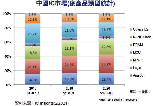 智慧型手機及各項電子產品在中國及全球的銷量快速成長,使得微處理器(MPU)(包含專用處理器)成為中國IC市場中占比位居第二的產品,在2020年成長12%,銷售額達到327億美元。占比19%的DRAM是中國IC市場中,2020年占比第三的產品。2020年DRAM及NAND Flash的記憶體市場占中國整體IC市場的30%。中國強勁的記憶體內需,驅動中國當地生產越來越多的DRAM及NAND Flash裝置。