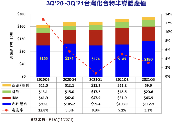PIDA統計2021年第三季台灣化合物半導體產業產值為新台幣190億元,季增3.1%,年增15.3%。其中長晶/磊晶產值為9.9億元,季減12.1%,年減10.3%;元件製造產值為113億元,季增9.7%,年增14%;IDM產值為47億元,季減9.5%,年增12%;封裝測試產值為20.6億元,季增11.6%,年增57.5%。
