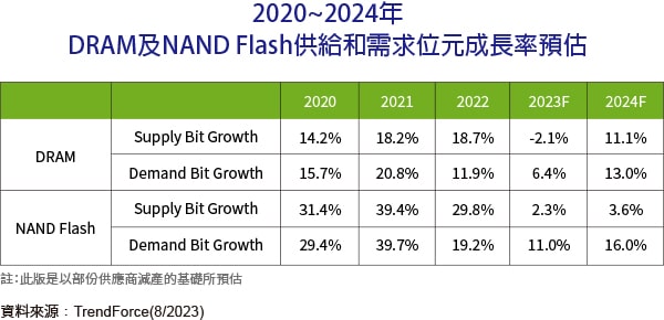 TrendForce預期,2024年記憶體原廠對於DRAM與NAND Flash的減產策略仍將延續,尤其以虧損嚴重的NAND Flash,其減產趨勢將更為明確。然而,有鑑於2023年基期已低,加上部分記憶體產品價格已來到相對低點,因此TrendForce認為,2024年DRAM及NAND Flash需求位元年成長率將分別為13.0%及16.0%。