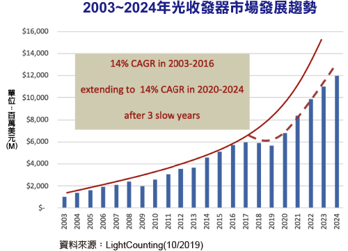 5G的部署將按預期進行,而將無線光纖前傳網路的需求提升到2020年及以後的新紀錄。根據產業研究機構LightCounting的研究指出,在2017~2019年比預期慢了三年之後,市場的成長遲到了,光收發器模組在2020~2024的預測是15%的年複合成長率,與2010~2016年產業成長紀錄相似。
