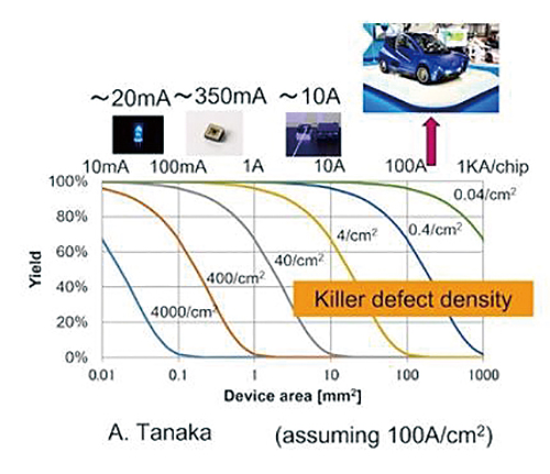 目前已經商品化的矽基氮化鎵,缺陷密度通常是每平方公分108以上。因此,如果要把矽基氮化鎵允用在電動車這類需要承受高電流的高功率應用上,元件本身的尺寸必須跟著放大,導致成本增加、系統的小型化能力也會面臨天花板。