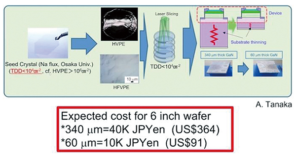 其次,材料的沉積工法也會對材料的製作成本帶來巨大影響。目前業界通常使用MOVPE製程(台灣業界通常以MOCVD稱之)來生長GaN材料,但這種製程相對複雜,設備成本也高,若要大量生產,廠商的前期資本投入是很高的,在一定程度上形成產業的進入障礙。因此,天野浩所帶領的研究團隊,將探索方向放在氫化物氣相外延(HVPE)製程上,並已經獲得一定的成果。根據研究團隊所做的成本試算,在同等產能的條件下,HVPE的設備投資規模,大概只要MOVPE的15%不到。