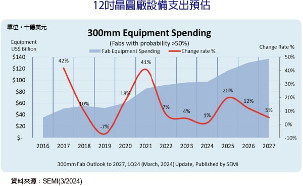 全球12吋晶圓廠設備投資預計將在2025年成長20%至1,165億美元,2026年將成長12%至1,305億美元,還將在2027年創下歷史新高。