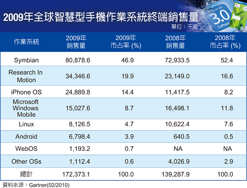 Gartner指出,2009年表現最好的智慧型手機作業系統為蘋果(Apple)的iPhone OS及Google的Android平台。iPhone OS的市占率較2008年大幅提升6.2%,不僅成長率為同業之冠,更是一舉取代微軟Windows...