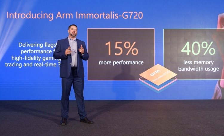 在GPU方面,Arm的第五代架構重新定義部份繪圖管線以降低記憶體頻寬,從而在行動裝置上實現次世代高幾何運算的遊戲以及即時3D應用,同時帶來更為順暢、且近似複雜的PC與電玩主機般的遊戲體驗。延遲頂點著色技術(Deferred Vertex Shading, DVS)是第五代GPU架構導入的新繪圖功能,它重新定義了GPU中的資料流,讓合作夥伴可以擴展GPU核心數量,達到更高的效能。與前一代產品Immortalis-G715相比,Immortalis-G720在效能與效率上提升了15%,同時系統層級的效率更大大提升了40%。這將帶來更好的圖形畫質,實現更加沉浸的視覺體驗。