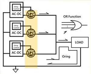以往的冗餘電源系統採用蕭特基二極體(Schottky Diode),雖然該項材料成本較為便宜,但是功耗大,且發熱情況嚴重,須再加大其散熱片,導致占用體積過於龐大;所以為了因應電源節能趨勢,現在已改用或環電晶體(Oring FET)(圖7),其導通電阻Rds,on可選用1mΩ以下,即可輕鬆解決功耗問題。
