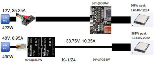 在眾多伺服器電源節能的方法中,48V的電源架構應算是較為特別的方式。其為XPA架構,造就48V的輸出電流較小,所以可讓傳輸損耗降低,損耗較小相對的效益即可提升,讓電力成本降低。