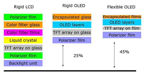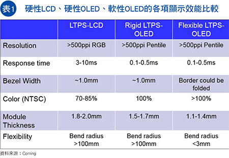 相較於LCD硬性顯示,即便軟性OLED顯示不做任何的凹折,其在薄度上就具有相當大的優勢,在厚度的部分,LCD為1.8~2.0mm,硬性OLED為1.5~1.7mm,而軟性OLED則是最薄的,可達1.1~1.4mm(表1)。且OLED的畫質也比LCD還要更好,無論是顏色飽和度還是視角等部分。再者,在反應速度上,LCD也比軟性/硬性OLED來得慢很多,LCD的反應速度在3~10ms,OLED則為0.1~0.5ms。此外,由於軟性OLED採用的是塑膠基板,因此其在耐摔程度上,也一定會比玻璃基板來得高很多。