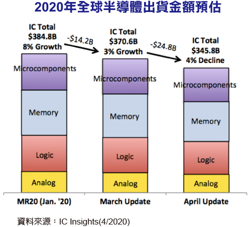 身處科技供應鏈最上游的半導體產業,在這個情況下也難以獨善其身。據IC Insights最新發表的預估數字,2020年全球半導體元件出貨金額預估數字已從年初的3,848億美元下修至3,458億美元,年成長率也從原本預估的正成長8%修正為衰退4%。其中,類比元件所受到的衝擊最小,邏輯元件跟記憶體的衰退則較為明顯。