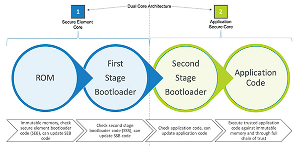 使用整合的SE後,可以根據圖1所示的流程,進一步採取完整的信任鏈步驟。其有效地擁有雙核心體系結構,第一個核心是SE本身,具有自己專用的快閃儲存、ROM、RAM和周邊設備。第二個核心是為物聯網設備設計通用的SoC,提供給所有的快閃儲存和周邊設備,如此才能有功能更強大的應用程式核心。