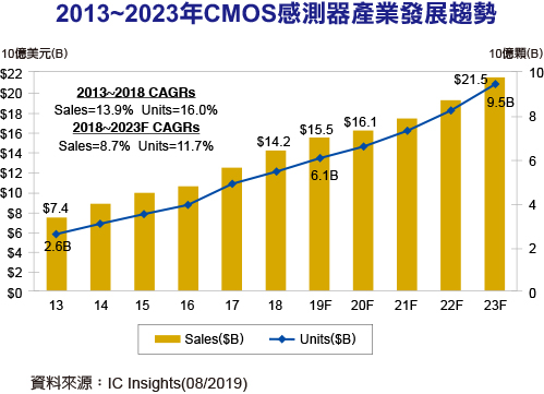 儘管預計今年和2020年的成長將趨緩,但預計CMOS影像感測器市場將在2023年前持續創新產業規模與產品出貨量,數位影像應用的普及抵消了全球經濟疲軟和美中貿易戰的衝擊。根據產業研究機構IC Insights的報告指出,預計2019年CMOS影像感測器的銷售額將成長9%,達到155億美元的歷史新高,然後在2020年成長4%,達到161億美元。