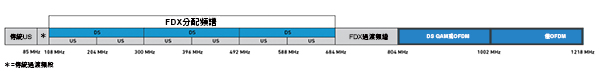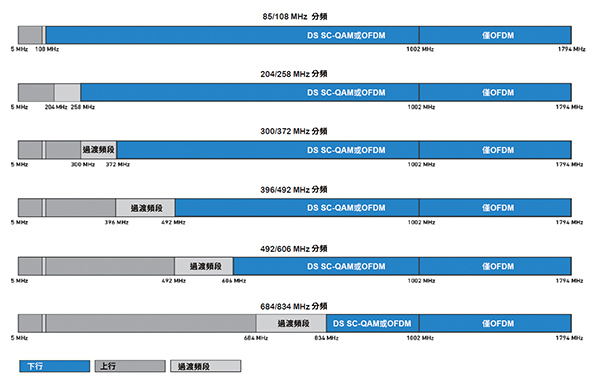 為滿足更高的上行頻寬需求,多系統營運商(MSO)開始考慮將上行增加到中分頻(頻寬從5MHz增加至85MHz)或高分頻(頻寬從5MHz至204MHz)。DOCSIS 4.0規範提供了300MHz、396MHz、492MHz甚至684MHz的分頻(圖1)。