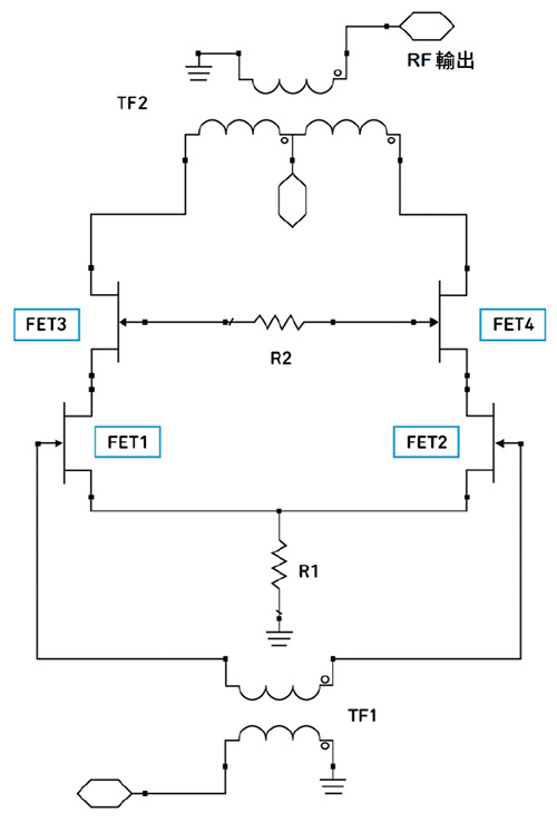 圖5為有線電視增益單元的簡化原理圖。它在推挽配置(平衡設計)中採用了兩個共源共柵,以消除二階失真並實現多倍頻寬。在可用於此類拓撲結構時,採用FET的GaAs技術改變了整個產業,且其現在仍可用於目前先進的有線電視增益單元放大器。利用GaN技術的可用性,透過使用GaN元件更換FET3和FET4,可對該現有架構進行改進。在維持架構不變的情況下,利用GaN固有的技術特性,可顯著提高系統的性能。