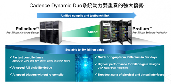 今年4月,Cadence推出Palladium Z2企業級硬體模擬加速系統和Protium X2企業級原型驗證系統,希望透過硬體模擬加速(Emulation)和原型驗證(Prototyping)工具,確保上述關鍵得以實現。Palladium Z2+ Protium X2這一組合被Cadence稱為動力雙重奏(Dynamic Duo)系統系統動力雙重奏,為系統模擬和驗證提供較佳的效能和容量支援。