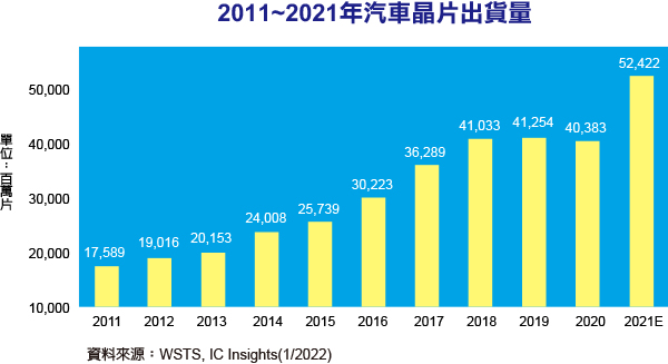 2021年汽車晶片出貨量的成長率,已經是自2011年以來的最高紀錄,且2021年的出貨量,已經比2011年增加2倍。同一期間全球晶片出貨量,則是從1,940億顆成長到3,940億顆,大約是增加1倍。換言之,汽車晶片的出貨量成長動能,要明顯優於整體晶片市場。