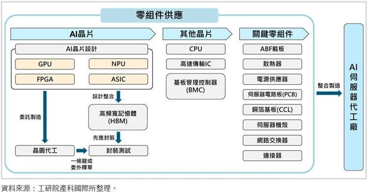 生成式AI與AI算力的需求快速攀升,也推動全球AI基礎建設進入新一輪投資高峰,為臺灣產業生態系帶來重要發展機會。臺灣在AI伺服器代工市場占有九成以上市占,並具備晶片設計、晶圓代工、封測、電源、散熱與載板等完整供應鏈,有機會從代工製造進一步轉型為AI資料中心整合服務供應商,提供一站式解決方案,涵蓋伺服器製造、機電整合、軟體測試與能源配置。此外,AI晶片需求也快速升溫,帶動封裝與散熱技術創新。臺灣可發展CoWoP、CoPoS等先進封裝技術與碳化矽材料,強化在高階AI晶片供應鏈中的主導地位。同時,矽光子與液冷散熱技術成熟,將催生光通訊與冷卻元件新商機,推升交換器、光收發模組與熱管理零組件需求。在資料中心發展方面,未來將朝高密度、節能化、模組化發展,若臺灣廠商能整合能源管理、機電工程與資安方案,將有機會成為全球AI基礎建設的重要輸出基地。從生成式AI、AI算力到AI晶片與資料中心整合,臺灣產業正迎來從代工製造走向高附加價值技術輸出與系統整合的轉型關鍵期,並持續鞏固其在全球AI產業生態中的戰略地位。