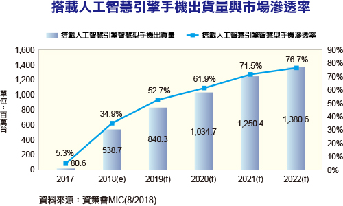 2017年智慧型手機搭載人工智慧引擎者為Apple iPhone 8與X系列,與華為Mate 10系列,出貨量達到8060萬台;2018年,Qualcomm、Samsung與聯發科也相繼推出人工智慧處理器,在眾多Android品牌大廠的支持下,預期出貨量將迅速攀升,預期到2019年後,人工智慧功能在智慧型手機的滲透率可突破五成,100美元以下的機種在聯發科與紫光展銳的投入下,也得以大量導入人工智慧引擎。