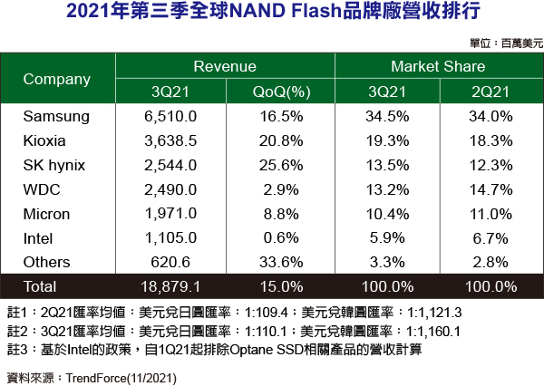 根據TrendForce研究顯示,第三季NAND Flash市場主要的成長動能由伺服器以及智慧型手機兩大主要應用的強勁需求帶動。其中,超大規模資料中心及企業用戶延續第二季以來的採買動能,以建置新平台產品;智慧型手機則受惠於主要品牌旗艦新機的備貨動能,故兩者均對該季需求增長貢獻卓著,然同時間NAND Flash供應商也開始示警PC OEM訂單需求轉弱。綜合而言,第三季NAND Flash位元出貨量成長近11%,平均銷售單價增長近4%,挹注整體NAND Flash營收再創新高,達188.8億美元、季增15%。