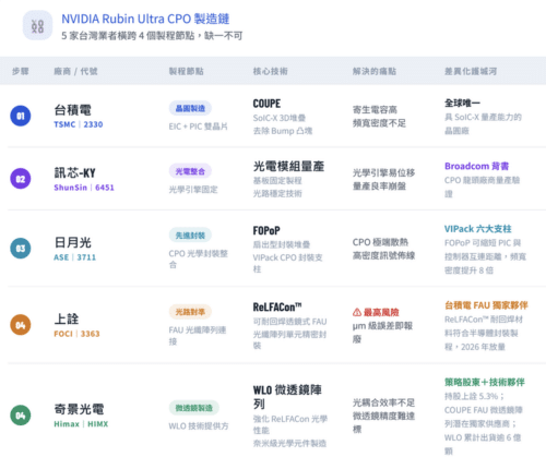 在這場良率的生死戰中,NVIDIA必須依賴一群能把良率做到極致的「執刀醫生」。而這群醫生,剛好都聚集在台灣。Rubin Ultra的CPO方案若要落地,以下四個環節缺一不可。
