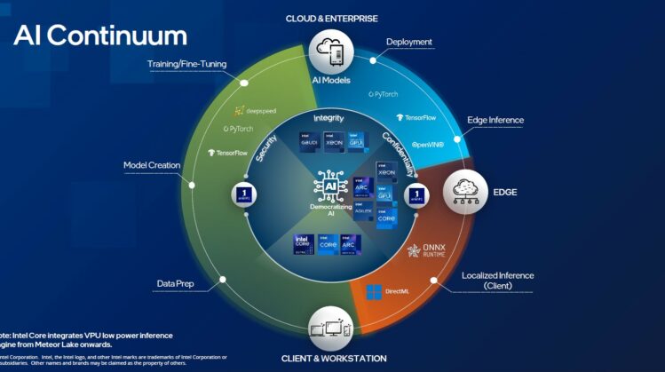 透過這兩項英特爾提供的技術,原本為其他硬體架構撰寫的軟體,只需要少量修改,就能在英特爾的硬體平台上獲得最佳化;反之,原本為英特爾平台撰寫的軟體,也可以布署到安謀(Arm)、蘋果(Apple)的平台上。這就是英特爾近年來一直強調的AI連續性(AI Continuum,圖2)。