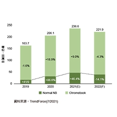 根據TrendForce調查,2020年因遠距辦公與教學等宅經濟需求,使筆電出貨表現打破過去年增、減3%的低谷循環,年成長近26%,而此波強勁的需求動能也延續至今,預估2021年出貨量將突破2.36億台,年成長率約15%。其中,因教育用筆電需求高漲所致,Chromebook將成為拉抬整體筆電市場成長的關鍵;品牌出貨表現則以Chromebook產品占比近五成的三星(Samsung),以及搭載M1晶片的蘋果(Apple)...