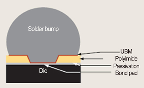 | 圖2 在直接凸塊WLCSP當中屬於選項性的有機層,用以在運作中的晶片表面做為應力的緩衝。聚亞胺會覆蓋整個區域,除了黏著焊點的開孔之外。UBM層則以噴濺或是電鍍的方式塗布於這些開孔處。 |