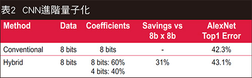 目前,CNN採用的最新技術是使用40W/TMAC(每兆倍累加運算瓦特數),而一般應用需要4TMAC,因此電力需求是160瓦(W),也就是說,現有嵌入式裝置的電力預算(Power Budget)根本無法容納。