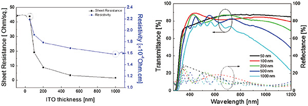 這是典型ITO膜的光電行為,膜越厚,則面電阻越低,但相對的光穿透率也跟著降低,尤其是800nm以上的長波長部分,光穿透度大幅下降,此特性在需要紅外線範圍的光電元件(如太陽能電池)應用,就會受到限制。
