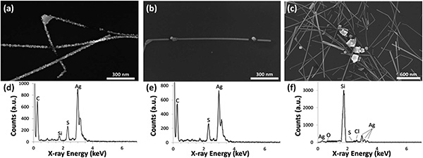 圖10(a)的奈米銀線表面產生許多絨狀物,經元素分析可以看出是硫化物,這是因為銀與硫有很好鍵結性,銀與硫化形成硫化銀是許多銀金屬應用共同的問題。奈米銀因為面積/體積比大,因此大氣中即便僅存在微量的硫化氫(H2S)、羰基硫(Carbonyl Sulfide, OCS),也會使奈米銀線劣化。圖10(b)則是典型的Rayleigh Instability現象;而圖10(c)則是特殊銀遷移(Silver Migration)的劣化現象。