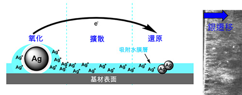 銀遷移也發生在許多電子元件中的銀線路失效,奈米銀線由於奈米效應,更容易發生。當奈米銀線在高濕度條件與外加能量如電場或紫外線作用下,銀原子氧化成離子並游離離開它初始位置並在另一個位置重新沉積形成銀遷移現象如圖11所示。