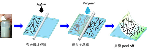 奈米銀線鑲埋法是把奈米銀線鑲埋到高分子膜中,在製作奈米銀線膜後,將高分子膜材塗布於奈米銀線上,最後撕膜(圖12)是常用的方法。高分子材料可以是透明PI、軟性的PU或是PDMS,這種製程除了克服附著度問題外,可以針對各種不同的應用選擇不同的基材。