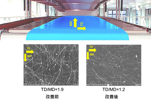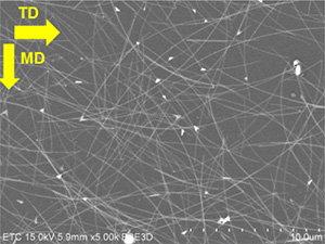 在軟性奈米銀線透明導電膜應用中,奈米銀線有序化排列會帶來兩個光電特性不利的影響,其一是有序化造成線與線間的交錯點減少,使面電阻增加;其二是塗布縱向(MD)與橫向(TD)的阻值差異很大,這種阻值的差異會造成元件驅動困難。此問題是過去奈米銀線透明導電膜應用於觸控面板所碰到的瓶頸之一。