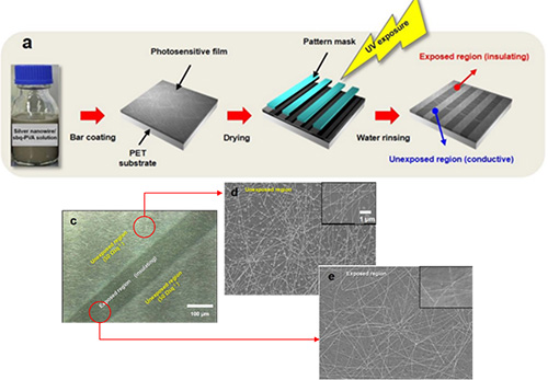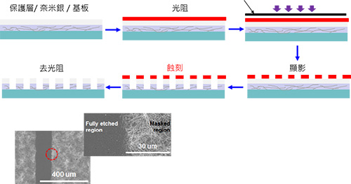 含有奈米銀線與光交聯樹脂的感光性奈米銀線墨水可簡化黃光製程。以UV光照射這種墨水,會使散布在交聯樹脂中的奈米銀線無法搭接導電,而成絕緣區域,其製程與圖案化結果如圖16。本法除了簡化黃光製程而達到圖案化目的外,也消弭了蝕刻痕的問題。