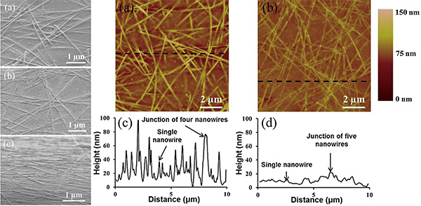 由於OLED各有機疊層都只有數十奈米厚,而奈米銀線直徑即達30~40nm,兩條奈米線搭接即達60nm以上的高低差,因此奈米銀線透明導電膜的高粗糙度是取代ITO在OLED應用須克服的最大問題。降低奈米銀線透明導電膜粗糙度最直接的方法是熱壓法。加拿大滑鐵盧大學Khaligh博士領導的研究團隊已成功利用熱壓法將線徑35nm的奈米銀線透明導電膜粗糙度壓到7nm(圖18)。