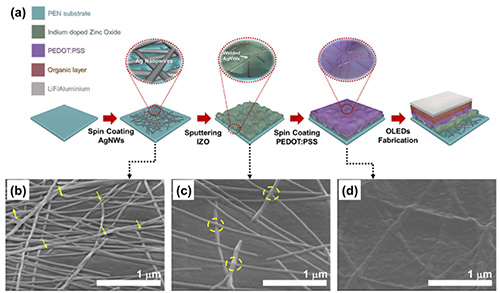 塗布可流動的平坦層也是解決奈米銀線透明導電膜高粗糙度的有效方法,導電高分子是理想的塗布材料。韓國大學Ho Jun Yun等人發表以PEDOT為平坦層的OLED製程如圖19。奈米銀線導電膜的粗糙度在以PEDOT平坦化後,可降到4.3 nm,以該電極製成的OLED元件可彎曲達萬次以上,在光電特性完全不亞於ITO透明電極。