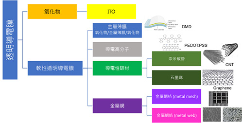 基於ITO的特性與軟性光電產品對可撓性的需求,軟性透明導電膜的技術開發方興未艾,這些技術包括金屬薄膜、氧化物/薄金屬/氧化物(Dielectric/Thin Metal/Dielectric, DMD)複合結構材料、具共軛鍵的有機導電高分子(Organic Conductive Polymer);具導電性的導電碳材如石墨烯(Graphene)、奈米碳管(Carbon Nanotube, CNT);或是設計肉眼看不到網格的結構如金屬網格(Metal Mesh)、金屬網(Metal Web),都是軟性透明導電膜具潛力的技術(圖2)。