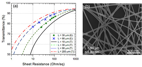 奈米銀線透明導電膜的導電度來自交錯的銀線,雖然銀線本身導電度非常好,但是銀線與銀線間的電子傳遞需跨過一個接觸電阻,因此在等重銀含量的條件下,線與線接觸點越多,則整體的接觸電阻就越大(圖4)。