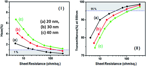 由於奈米銀線會引發光散射現象,因此奈米銀線網路的密度越高,散射現象會越明顯,造成透明導電膜的霧度上升。因此,當奈米銀線比較粗,光散射就會比較明顯,霧度也就比較高。比較20、30、40 nm的奈米銀線在不同面電阻下霧度與光穿透度如圖6,由圖中可以看出在相同的面電阻下,20nm表現出較低的霧度與較高的光穿透度。