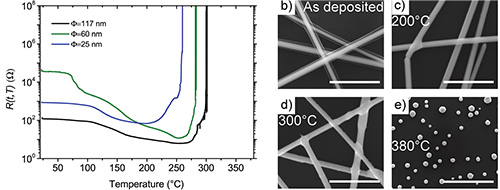 奈米銀線是高長徑比的材料,從晶體結構或是從熱力學的角度來看,是處於較不穩定狀態,若有足夠的能量,奈米線有形成球狀結構的傾向,這稱為Plateau–Rayleigh Instability,這是材料本質的問題。從製程與應用的角度,外在能量往往來自熱處理製程,不同線徑的奈米銀線Rayleigh Instability的程度不一樣。圖8是不同線徑在不同溫度下,面電阻變化的情形。