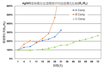 外在環境的不利因子是奈米銀線穩定性問題的另一個來源,這些不利的環境因子包括反應性氣體(水氣、硫化物)、與紫外線等。透明導電膜面電阻增加是奈米銀線劣化的指標,如圖9所示。