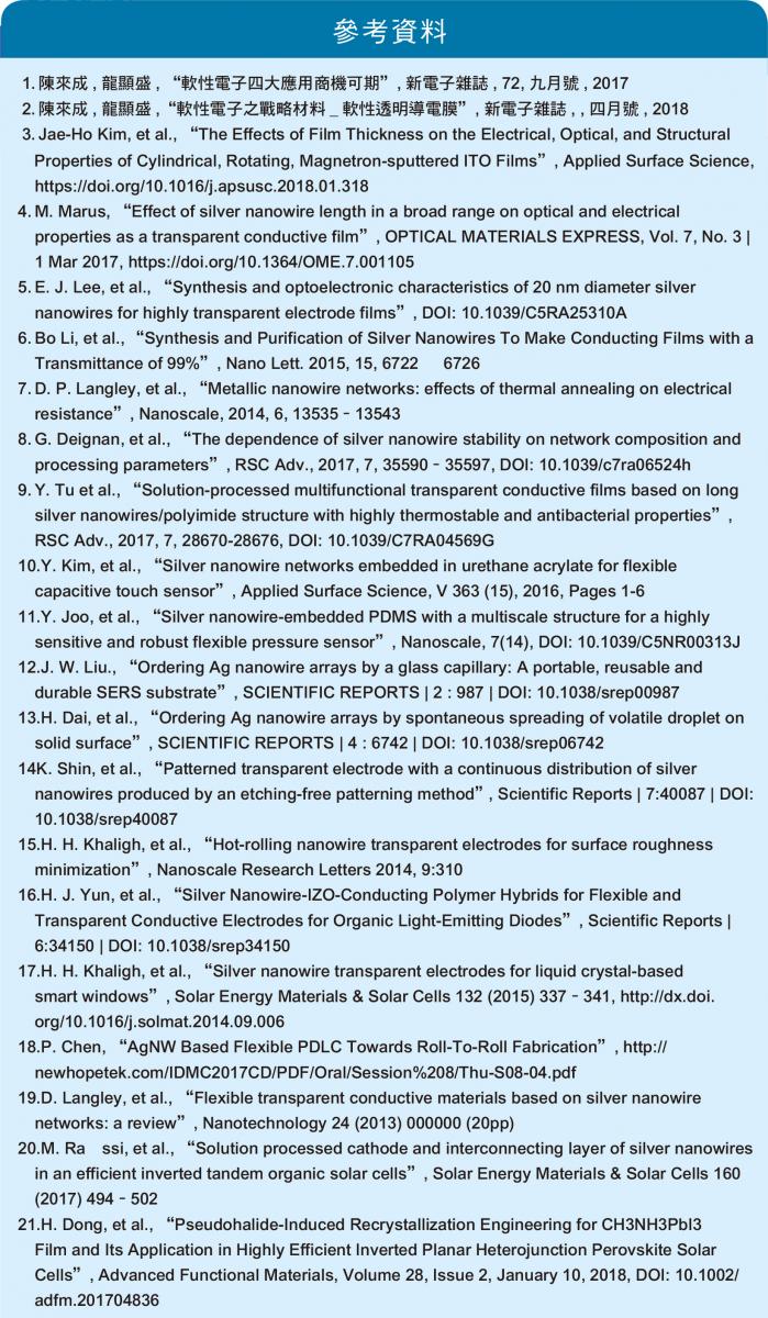 經過多年的發展,軟性奈米銀線透明導電膜技術已日臻成熟,軟性奈米銀線應用相關的問題逐漸釐清與解決;同時,從奈米銀線、墨水、塗布設備到膜材生產與應用的產業鏈也逐漸成形。在市場對軟性的光電產品需求日益殷切之際,期待產業能透過產業鏈聯結與技術整合,以材料、製程與設備的優化來掌握這軟性光電產業的戰略性材料。