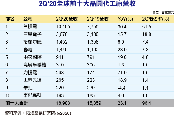據TrendForce旗下拓墣產業研究院最新調查,2020年第一季晶圓代工訂單未出現大幅度縮減,以及客戶擴大既有產品需求並導入疫情衍生的新興應用,加上2019年同期基期低,全球前十大晶圓代工業者2020年第二季營收年成長逾2成。